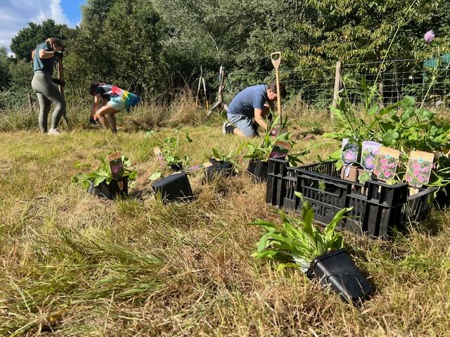 Wir erfreuen uns nach wie vor an unserer Blühwiese. Auch wenn fast alle Pflanzen verblüht sind, steht die Malve noch immer in voller Pracht auf der Fläche und bietet Insekten einen letzten Schmaus, bevor die kalte Jahreszeit einbricht. Pünktlich im Spätsommer haben wir ein zweites Mal die Fläche gemäht und abgeharkt. Innerhalb des Zaunes pflanzten wir, wie auch im letzten Jahr, 146 heimische Stauden. So können wir die Ausbreitung der Arten auf der gesamten Fläche ein wenig beschleunigen. Gepflanzt wurden Rundblättrige Glockenblume, Wiesen-Flockenblume, Moschus-Malve, Wilde Möhre, Acker-Witwenblume, Kuckucks- und Rote-Lichtnelke, Taubenkropf-Leimkraut.