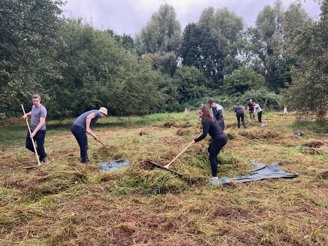 Im August stand die erste Mahd unserer Obstwiese an. Neben der Sense kam auch zum ersten Mal unser neuner Balkenmäher zum Einsatz. Die tier- und pflanzenschonende Mahdtechnik und die höhere Arbeitsgeschwindigkeit haben uns von der Maschine überzeugt, so dass wir zukünftig verstärkt motormanuell arbeiten werden. Das Zusammenharken ist aber nach wie vor nur durch Muskelkraft möglich. Mit Unterstützung freiwilliger Helfer haben wir unsere Blühfläche und eine weitere Fläche von rund 1000 qm gemäht und zusammengeharkt. Das Mahdgut muss runter von der Fläche, um die konkurrenzstarken Gräser zurückzudrängen und somit der Fläche Nährstoffe zu entziehen. Denn die meisten Blühpflanzen lieben eher nährstoffärmere Standorte.